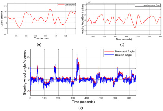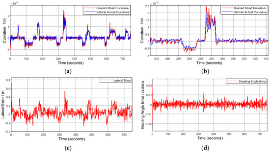 The Figures below show a 700 s/11 min recording with multiple scenarios on a public highway with the vehicle driven at approximately 31 mps/122 kph. This covers a significant distance with various scenarios, including straight roads, curved roads with different radii, and lane changes. Figure 11a depicts the desired road curvature coming from the camera versus the vehicle’s actual curvature, which illustrates that the vehicle curvature is following the desired curvature very well. Figure 11b is a zoomed-in view of Figure 11a, illustrating a section that transitions from a straight road to a mild curve (approximately 0.0005 ), then back to a straight road section, followed by a sharper curve (approximately 0.002 ), and finally, exiting to another straight section. As illustrated in Figure 11b, the controller’s behavior at curve entry and curve exit is very good, which are the most challenging scenarios due to the transitioning maneuver. Figure 11c,d illustrates the lateral position error and the heading angle error throughout the entire recording. As the recording encompasses a range of scenarios and transition maneuvers, the errors are not constant and will fluctuate with each maneuver. The spikes in errors align with changes in maneuvers (such as entering or exiting a curve), as these correspond to a shift in the controller’s setpoint. It can be noticed by examining Figure 11c, for example, that the lateral error is very small on a straight road (below 0.15 m), and it increases up to 0.4 m at curves and lane changes. This is because on a straight road, there is only feedback steering angle and no feed forward, but at curves and lane changes, a feedforward is added to the feedback; that is why the lateral error increases, but that does not mean that we are not following the trajectory closely, as can be seen from Figure 11a. Likewise, in Figure 11d, the heading angle error is larger at curves and lane change maneuvers because of the addition of the feedforward, and again, we are still following the trajectory very well, as can be seen in Figure 11a. Figure 11e is a zoomed-in view of Figure 11c, focusing on the lateral position error during a straight section, while Figure 11f is a zoomed-in view of Figure 11d, focusing on the heading angle error during the same straight section. As evident, the peak lateral position error is approximately 0.12 m and the peak heading angle error is approximately 0.0022 radians, which is excellent and not easily achieved by a real vehicle on the road. Figure 11g illustrates the desired steering angle commanded from the controller vs. the vehicle’s actual measured angle along the entire recording. As can be seen, the controller is able to obtain the desired angle it is requesting with near-zero error without saturating the actuator, even though there are high actuator limitations at such high speed.