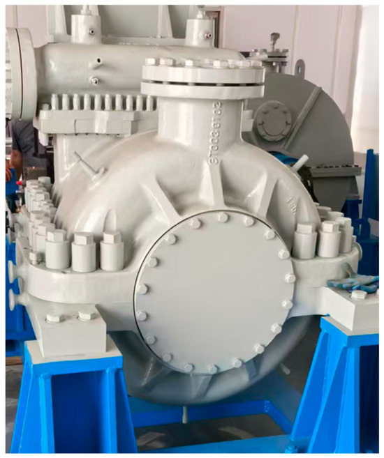 A full-scale 1:1 exhaust hood of a marine compact steam turbine is employed as the research object. Real-time flow-rate and pressure data acquired from the turbine test rig are used to prescribe boundary conditions and to benchmark the numerical results. The experimental steam turbine test rig comprises a three-stage stator-rotor blade assembly and an exhaust hood. Due to instrumentation limitations on the test rig, pressure measurement points were installed solely at the exhaust hood outlet, precluding direct monitoring of the last-stage exit pressure. Consequently, a constant through-flow steam mass flow rate was specified as the inlet boundary condition for the numerical simulations. When operating at the rated condition, the steam mass flow rate through the turbine is 5.5 kg/s. Concurrently, pressure transducers at the exhaust hood outlet recorded a stabilized average outlet pressure of 0.035 MPa. The test facility is illustrated in Figure 1.