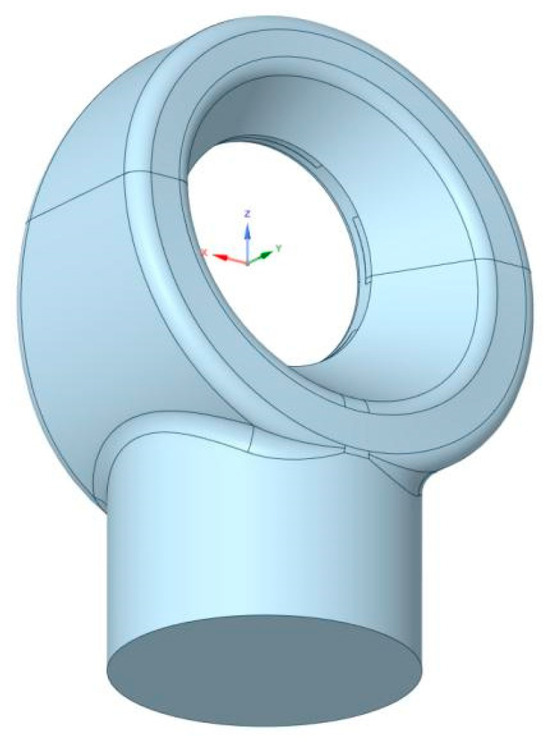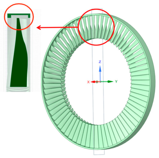 To conduct a thermodynamic and flow field analysis of the last stage–exhaust hood coupled model, we established a 3D model of the coupled flow field of the last stage and the exhaust hood. In this section, first, a fully 3D solid model of the last stage–exhaust hood flow field was established. The fluid domain included the last-stage blade cascade, which comprised stationary and moving blades. The last-stage blade cascade was arranged in an axially symmetric pattern. To reduce the number of grids and enhance computational efficiency, single passage calculation was used. However, considering the impact of the external shroud of the moving blade on aerodynamic performance, a combination of a single stationary blade passage and a full-circumference moving blade passage was used to more vividly display flow characteristics. The simulation model of the exhaust hood is shown in Figure 2.