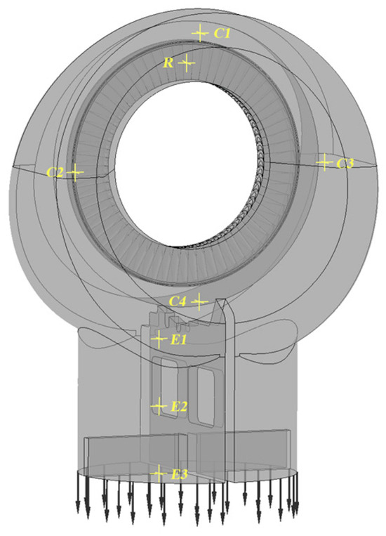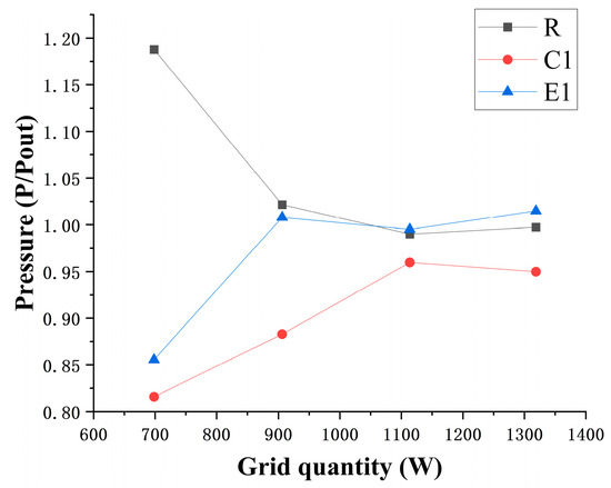 Grid resolution correlates positively with computational accuracy and resource demand; hence, a grid-independence study is performed to achieve the optimal balance. Eight monitoring points are strategically placed at the last-stage blade exit (point R), exhaust volute (point C1-C4), and downstream diffuser (point E1-E3), as indicated in Figure 4.