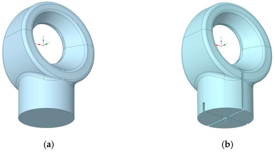 Changes in the steam turbine’s last stage–exhaust hood structure directly impacted its thermodynamic performance and flow field. Thereafter, we conducted an in-depth comparative analysis of the thermodynamic and variable condition flow characteristics of the last stage–exhaust hood coupled structure before (without shroud and reinforcing ribs, as shown in Figure 8a) and after optimization (with shroud and reinforcing ribs, as shown in Figure 8b).
