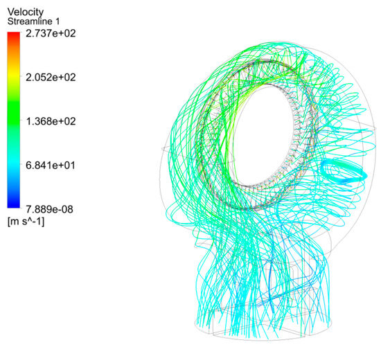 Figure 9 presents the three-dimensional streamlines of the baseline model under strong coupling between the free last-stage blades and the exhaust hood. Steam enters through the stator inlet and is accelerated by the last-stage stator blades; owing to blade curvature and stagger angle, it emerges as a swirling jet into the exhaust hood. Under the combined action of fluid inertia and viscous forces within the scroll, a pronounced channel vortex forms at the junction between the volute and the diffuser. Flow in the upper scroll travels as a channel vortex along both sidewalls before merging and mixing with the lower stream. A high-velocity region on the inner surface of the scroll generates significant flow-induced excitation. Guided by the turning vanes, the flow transitions from the axial to the radial direction, establishing the dominant channel vortex within the exhaust passage. The steam then decelerates progressively through the diffuser and exits the exhaust hood.