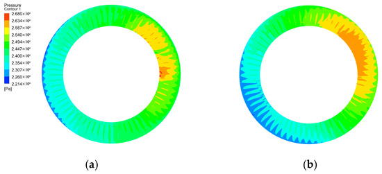 Last-stage blades outlet pressure contour diagrams: (a) without shroud; (b) with shroud.