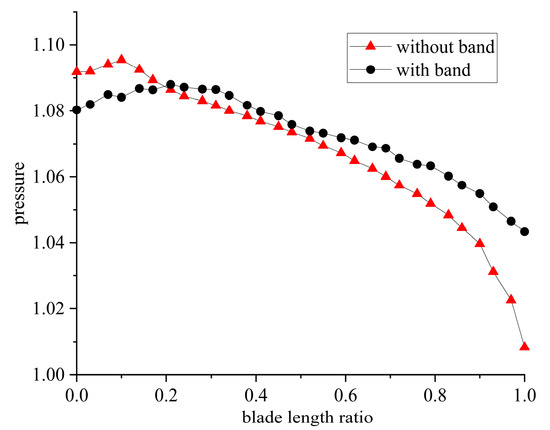 Figure 10 presents pressure contour diagrams at the outlet of the last-stage blades with and without the shroud coupled. Figure 11 shows pressure distribution curves at the outlet of the last-stage blades; these were taken from the same horizontal cross-section through the shaft center.