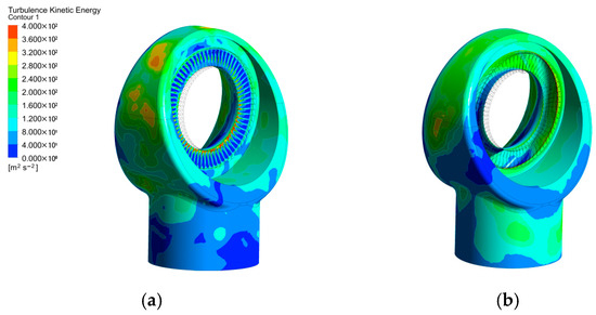 Figure 12 displays the distribution of turbulence kinetic energy in the exhaust hood flow field. The last stage without the shroud exhibited higher turbulence kinetic energy on the side walls of the exhaust hood volute. This was primarily because the steam flow directly impacted the exhaust hood volute after it was discharged from the last stage; this resulted in increased local turbulence intensity and greater likelihood of significant steam flow excitation effects. After the shroud was added to the last stage, the turbulence kinetic energy on the volute decreased significantly, resulting in a more uniform steam flow.