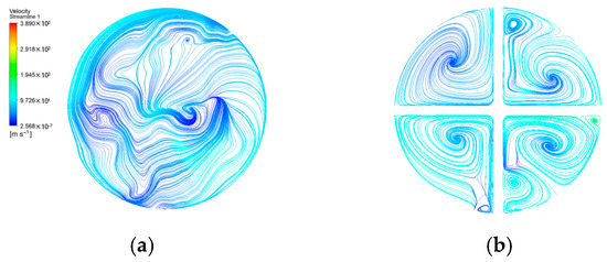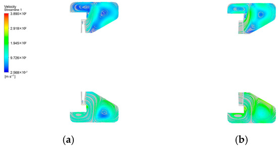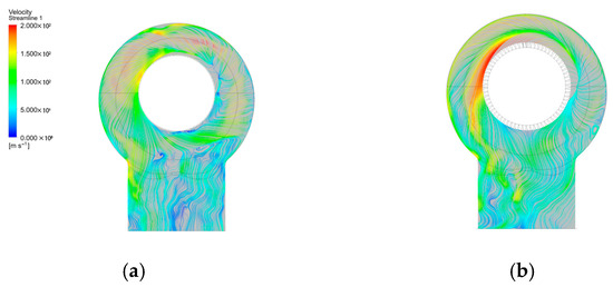 Exhaust hood diffuser at the horizontal mid-plane streamline diagrams: (a) without reinforcing ribs; (b) with reinforcing ribs.