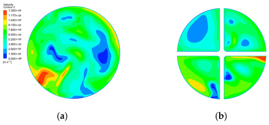 Figure 16 shows the velocity distribution contour diagrams at the exhaust hood outlet before and after installing the reinforcing ribs. Because of the reinforcing ribs, a smoother trend in the decrease in steam velocity was observed at the exhaust hood outlet. Sixteen measurement points were randomly selected at the same positions at the outlet of both models to measure the velocity non-uniformity at the outlet cross-section. The velocity non-uniformity at the exhaust hood outlet without reinforcing ribs was 0.605, and with cross-shaped reinforcing ribs installed, it was 0.427. This indicated that installing the cross-shaped reinforcing ribs led to a more uniform distribution of steam velocity at the outlet, and this was beneficial for the steam entering the condenser from the exhaust hood.