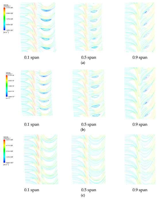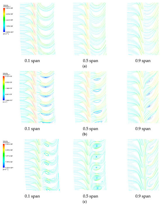 Streamline diagrams at different blade span within the last-stage blades under three flow conditions: (a–c) 10, 50, and 100%, respectively.