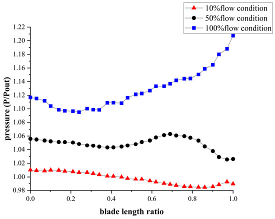 Pressure variation curves at different blade span within the last-stage blades under three flow conditions.