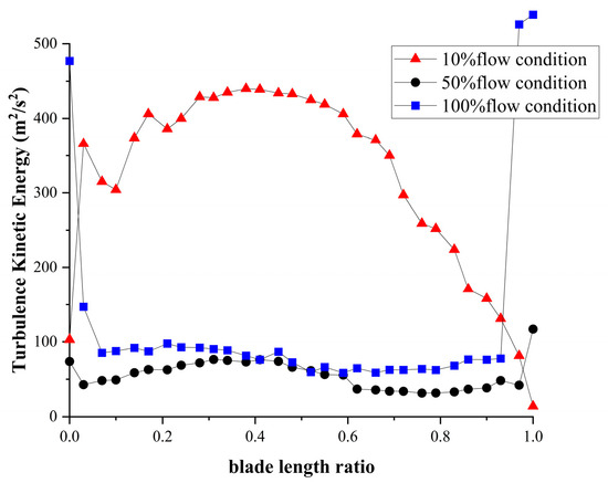 Figure 19 shows the turbulence kinetic energy variation curves at different blade heights in the last-stage blades under the three flow conditions. At a 10% flow rate, the turbulence kinetic energy was less at the blade root and tip but high at the middle of the blade, which indicated significant turbulence. At a 50% flow rate, the turbulence kinetic energy was relatively low across the entire blade outlet. However, at a 100% flow rate, the turbulence kinetic energy was high at the blade root and tip but low in the middle, suggesting that at high flow rates, the blade root and tip influenced the steam flow, leading to energy losses. This model demonstrated better aerodynamic performance under the 50% flow rate condition.