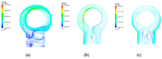 Plane streamline diagram of the exhaust hood under three flow conditions: (a–c) 10, 50, and 100%, respectively.