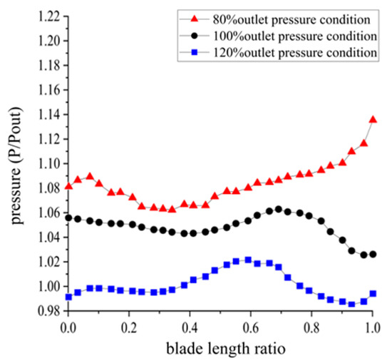 Pressure variation curves at different blade spans within the last-stage blades under three outlet pressure conditions.