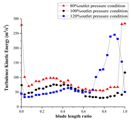 Figure 23 shows the turbulence kinetic energy variation curves at different blade heights within the last-stage blades under the three conditions. Under the 80% exhaust pressure condition, the turbulence kinetic energy was higher at the blade root and tip, indicating significant turbulence. At the 100% exhaust pressure condition, the turbulence kinetic energy was relatively low across the entire blade outlet. Under the 120% exhaust pressure condition, the turbulence kinetic energy was higher at the blade root and lower at the tip, suggesting that under low or excessively high exhaust pressure, strong turbulence occurred at the blade root, causing significant energy loss. Notably, under low exhaust pressure conditions, turbulence also occurred at the blade tip. The best aerodynamic performance was achieved under the 100% exhaust pressure condition.