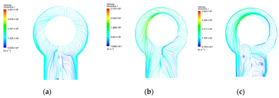 Plane streamline diagram of the exhaust hood under three outlet pressure conditions: (a–c) 80, 100, and 120%, respectively.