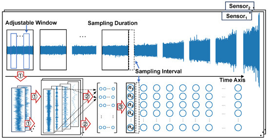where refers to the dimensions extracted, represents the number obtained after the EMD process, is the number of time-domain features from [24] that have been verified as degradation-sensitive features, denotes the number of adjustable windows into which the sampling time is divided, and signifies the number of sensors involved.