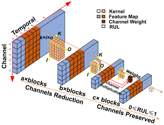 An effective prediction depends on well-informed input for deep-learning-based approaches [15]. Among signal processing methods, Empirical Mode Decomposition (EMD) [32] is particularly suitable for processing complex non-stationary and nonlinear signals. Meanwhile, this method has been demonstrated to effectively enhance input information for prediction tasks [33,34,35]. As part of hybrid feature engineering, EMD can adaptively decompose the raw signal into multiple time–frequency-scale intrinsic modal functions (IMFs) across different time–frequency scales, thereby mitigating the influence of noise on the original signal. This advantage effectively solves the problem of hybrid engineering mentioned above. Moreover, in recent times, one-dimensional convolution neural networks (1D-CNN) have demonstrated considerable potential in processing long sequences [36]. The convolution mode inherently has the feature of parameter sharing to reduce the number of parameters. Additionally, it can further reduce the parameters by adjusting the convolution category, kernel sizes, and the number of channels [37,38]. In a typical 1D-CNN architecture, the number of channels gradually increases as the network depth increases, while the time dimension, namely the feature map, is gradually reduced through pooling operations [21,39,40]. However, reducing the time dimension resolution through pooling can lead to the loss of important temporal information, which is critical in tasks such as RUL prediction. In this regard, a Physics-informed hybrid bearing RUL estimation method is proposed based on the windowed EMD feature engineering method, an effective multi-model flexible configuration strategy, and one-dimensional temporal convolution neural network models, and the novel method provides a robust and accurate solution for bearing RUL estimation. It primarily comprises three aspects: