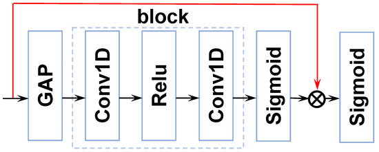 where denotes the input at time step t and channel c, and T represents the total time steps. Matrices and are learnable parameters. The ReLU activation function introduces nonlinearity, while the Sigmoid function constrains the channel weights to the range . These weights selectively emphasize important channel features while suppressing less relevant ones.