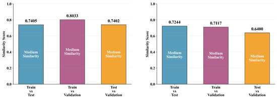 The synthetic time-series data preserve temporal characteristics based on the linear degradation model from Section 2. The synthetic component generates new RUL values with small perturbations, then uses linear interpolation to map RUL to features. Three perturbations ensure uniqueness: (1) horizontal perturbations based on inter-bearing variation, (2) vertical perturbations proportional to feature standard deviation, and (3) degradation perturbations across degradation stages. Synthetic samples use 50–70% of the original bearing data length. To validate the quality of the synthetic data, a comprehensive similarity analysis was performed between training, testing, and validation datasets using working conditions 1 and 2 as representative examples. Figure 5 presents the comparative analysis of dataset similarity on normalized features using multiple metrics, including statistical moments, quantiles, distribution shapes, KS-statistic-based similarity scores, and correlation structures, with averaged similarity scores for evaluation.