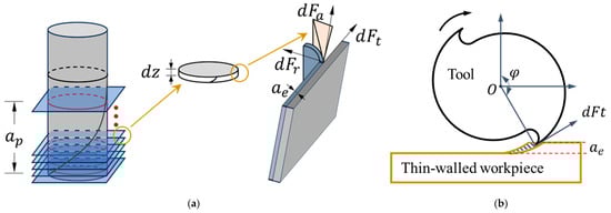 Based on the proportional relationship between cutting force and instantaneous undeformed chip thickness, this study employs an equivalent shear force model to establish a micro-element milling force model. This modeling method can effectively characterize the force–thickness relationship during machining, providing accurate mechanical input for subsequent deformation analysis []. This model was proposed by Professor Yusuf Altintas and is widely used in the field of mechanical processing. Recent studies have pointed out certain limitations of this method, primarily focusing on the qualitative analysis of stress during plastic deformation, which leads to inaccuracies in the cutting force coefficients []. Since the experimental subject of this paper is planar side milling, which does not involve complex surface machining, and the accuracy of the milling force model has already been validated in previous work, this paper selects this milling force model as the foundation for subsequent research [,]. Specifically, this model achieves an accurate calculation of cutting forces by discretizing the tool into a series of axially distributed micro-disk elements, as shown in Figure 1. Here, is the cutting depth, is the cutting width, is the thickness of the chip micro-element, and , , and are the tangential, radial, and axial cutting forces of the cutting edge micro-element , respectively.