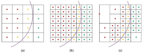 Relationship between the cutting edge and the voxel model. (a) Coarse voxel model; (b) Fine voxel model; (c) Voxel octree model.