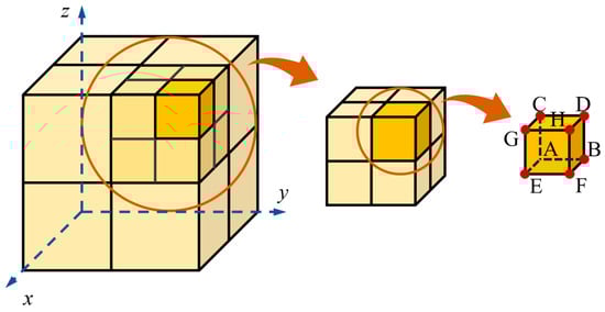 As shown in Figure 2, regardless of whether the model is based on coarse or fine voxels, material removal along the tool envelope surface can be effectively achieved during milling. However, in the coarse voxel model (Figure 2a), due to the larger voxel blocks, the cutting edge is farther away from the actual uncut voxel units, which may result in significant errors in stiffness and deformation calculations. In the fine voxel model (Figure 2b), due to the smaller voxel blocks, the cutting edges can be closer to the uncut voxel units, but this greatly increases the computational load of the stiffness model. Therefore, this paper proposes the voxel octree model. It uses large voxel units at locations far from the cutting edge and divides them into smaller voxel units as they become closer to the cutting edge, thereby achieving an efficient and accurate stiffness model and workpiece deformation calculation.