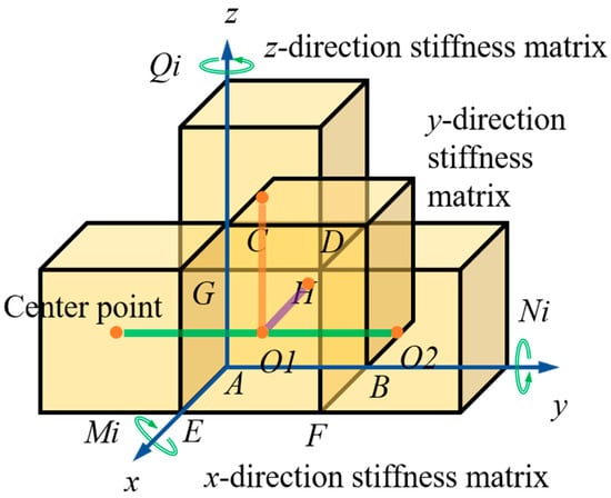 By combining the above equations, four stiffness matrixes, , , , and , can be obtained. Specifically, as shown in Equations (14)–(17):