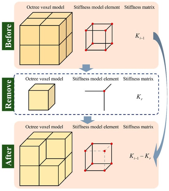 The stiffness matrix update method used in this paper is shown in Figure 5. As mentioned above, when the tool collides with the voxel octree node, the node is removed, and the stiffness matrix of the node is also removed. Assume that the stiffness matrix of the voxel octree model is , and the upper right voxel is cut off. Then, the stiffness matrix of this node must be removed from the original model stiffness matrix. Finally, the updated stiffness matrix is obtained, as shown in Equation (21).