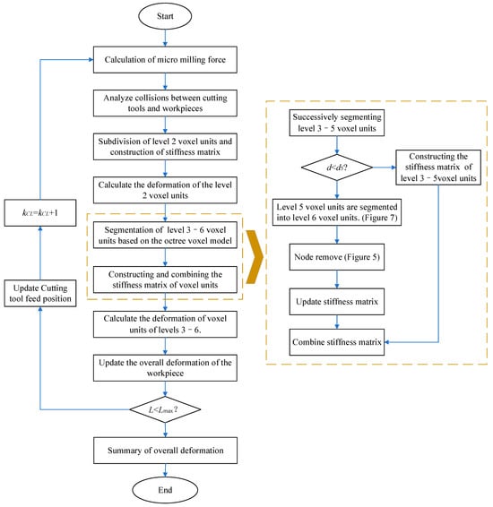As shown in Figure 6, first calculate the micro-element milling force and analyze the collision between the milling cutter and the workpiece. Divide the workpieces into level 2 voxel units and calculate the deformation. Since the unit grid of the level 2 voxel units is relatively sparse, the initial deformation of the workpiece can be calculated more quickly. This step can quickly approximate the actual deformation of the workpiece and effectively reduce the complexity of the calculation efficiency. Then, voxel units at appropriate positions are divided according to the voxel octree model. Stiffness matrixes corresponding to level 3–6 voxel units are constructed, and deformation is calculated in combination with microelement milling force. Finally, the deformation of level 2, 3, 4, and 5 voxel units is uniformly subdivided into level 6 voxel units, and the overall deformation of the workpiece is obtained by summarizing them.
