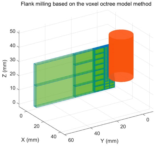 According to the simulation conditions, the flank milling process was simulated, as shown in Figure 9. The red color represents the flat-end milling cutter model, and the green color represents the thin-walled aluminum alloy workpiece. It can be seen that the thin-walled workpiece is divided into six levels of voxel models according to the octree theory. The voxel units far away from the tool are divided into low-level voxel units, and the closer to the tool, the higher the level of the voxel units.