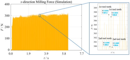 In actual machining, flank milling deformation of thin-walled workpieces mainly occurs in the radial direction of the tool. Therefore, this paper mainly investigates the deformation of the flank milling end of the workpiece, i.e., the deformation in the x-direction. The milling force in the -direction is obtained according to the simulation parameters in Table 2, as shown in Figure 10. As can be seen from the figure, the peak milling force information for tooth 1 and tooth 2 is shown. Since the two-tooth milling tool used in this paper has uneven tooth load issues, there is a difference in the peak milling force between the two teeth [].