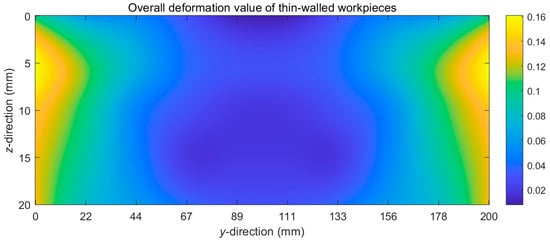 The overall deformation of the aluminum alloy thin-walled workpiece in the x-direction was calculated using the voxel octree model proposed in this paper, as shown in Figure 11. It can be seen that the overall deformation of the workpiece is not uniform. Along the y-direction, the deformation at the edges of the workpiece is significantly greater than that at the center, which is due to the weaker stiffness of the edges compared to the center. Along the z-direction, the deformation at the bottom is smaller, which is caused by considering the workpiece to be a cantilever beam model.