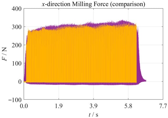 During the machining process, the KISTLER 9255C dynamometer was used to simultaneously measure the x-direction milling force, and the milling force results shown in Figure 13 were obtained. The dynamometer settings are as follows: the sampling frequency is 4000, the filter type is a low-pass filter, and the average force calculation is the period average. The simulation results and experimental results of the -direction milling force are shown in Figure 14. Since the cutting coefficients provided in Table 3 were calibrated in advance using the same machining method as the machining experiment, and Figure 14 shows that the amplitude of the simulated milling force and the experimental milling force are basically consistent, it can be concluded that the milling force model in this paper is correct.