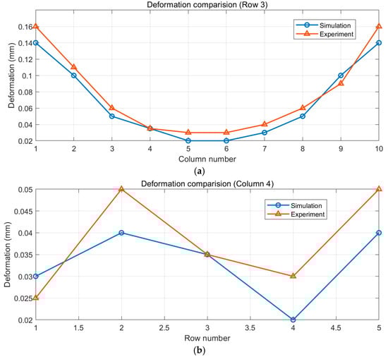 Comparison of simulated and measured values of workpiece deformation for random matrices. (a) Comparison results for Row 3; (b) Comparison results for Column 4.