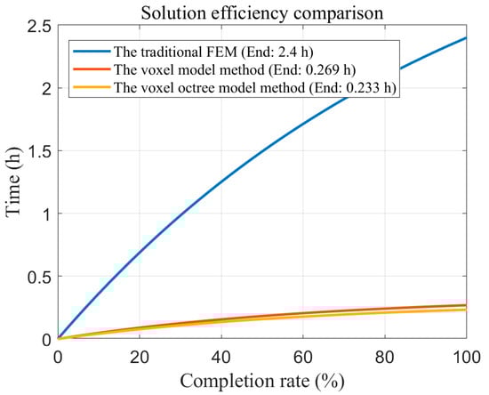 Meanwhile, this paper compares the efficiency of deformation prediction using traditional FEM, the voxel model method [], and the voxel octree model method, with the results shown in Table 4 and Figure 19. The hardware configuration of the computational platform is Windows 11 with an Intel Core i7-13700 processor. The simulation software based on FEM is Workbench 23 R1. The tool is treated as the rigid body, and the bottom of the workpiece is fixedly connected. The element type is a quadratic element, the mesh size is 0.2 mm, the material removal is element erosion, the time step is 1.5 × 10−7, the displacement residual is 0.5%, and the stopping criterion is tool displacement of 200 mm. As shown in the table and the figure, the voxel octree model method demonstrates significant improvements compared to the other two methods, achieving more than a 90% increase compared to the traditional FEM and a 13.2% increase compared to the voxel segmentation method. Specifically, the computational complexity of the three methods is compared in Table 5, where represents the number of cells/voxels, and represent the number of coarse and fine voxels, respectively. It can be seen that the computational complexity (memory occupation, single step solution time, and preprocessing time) of the method proposed in this paper is significantly lower than that of the other two methods. This is because although traditional finite element methods are highly accurate and particularly suitable for stress–strain analysis of continuous media, the computational complexity increases sharply with mesh density (). The voxel model method is simple to model, but it increases computational complexity during the detailed calculation stage. The voxel octree model method proposed in this paper achieves a balance between accuracy and efficiency by performing local refinement in the cutting area and thin-walled critical locations, and using coarse voxels in areas far from the cutting area.