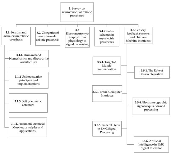 This structured approach enabled a thorough examination of scientific literature, forming the basis for the subsequent discussion on current trends and future directions in the development of robotic prosthetic devices. Given the layered structure of the following section, a flowchart is provided in Figure 2 to summarize the hierarchical organization of the content of the manuscript.