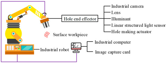The robot vision subsystem, as the core of the system, integrates components such as line-structured light sensors, hole-making actuators, and industrial computers. The end effector for hole-making integrates a line-structured light sensor and an industrial camera, allowing it to obtain real-time information on the surface of the component during the hole-making process, providing accurate guidance for hole-making operations. The image acquisition card is installed inside the industrial computer, which is responsible for processing and transmitting image data, ensuring the accuracy and real-time performance of the information.