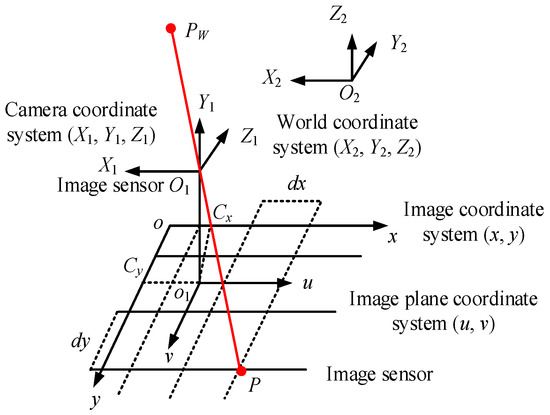 To accurately convert the coordinates of pixels between the image coordinate system and the image plane coordinate system, the conversion relationship between these two is represented by Equation (1) [32].