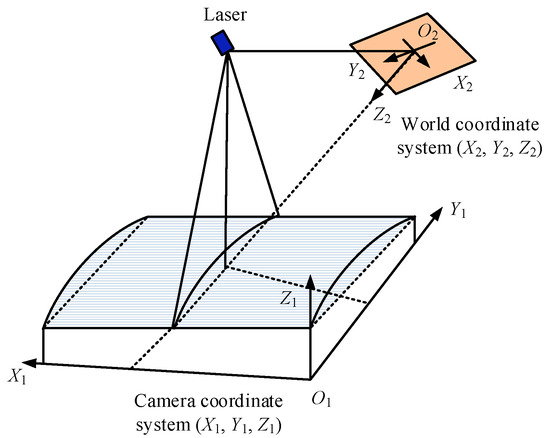 The image information obtained by industrial cameras is usually two-dimensional pixel coordinates, which cannot directly reflect the true position and posture of the workpiece in three-dimensional space [30]. In order to achieve effective conversion between spatial information and image information, the camera imaging mechanism is modeled through camera calibration. The scanning accuracy of the linear structured light sensor is ≥0.01 mm, and the resolution of the industrial camera is ≥2560 × 2048, with a frame rate of ≥138 fps, to adapt to the large size and complex curved surface characteristics of aviation components. The target measurement uncertainty of the calculation normal direction is set to ≤0.5°. It involves precise measurement and calculation of internal parameters of the camera (focal length, optical center position, lens distortion, etc.) and external parameters (the position and orientation of the camera in the world coordinate system), as well as the conversion and correlation of the camera coordinate system , image plane coordinate system , world coordinate system , and image coordinate system , as presented in Figure 2 [31]. These coordinate systems exert a meaningful role in the camera calibration process, helping to describe and calculate the relationship between image information and three-dimensional spatial information.