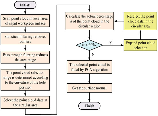 Subsequently, based on the preprocessed point cloud data, the normal vector of the position of the hole to be fabricated is calculated using the PCA algorithm and compared with the theoretical normal. If the normal error exceeds the allowable range (set as 0.5° in this study), iterative compensation is carried out by adjusting the local point cloud extraction range (dynamically optimizing the diameter of the circular area according to the process in Figure 7) and the PCA parameters, and the normal vector is recalculated until the error meets the requirements. Ultimately, the corrected normal parameters are input into the robot control system to guide the hole-making operation.
