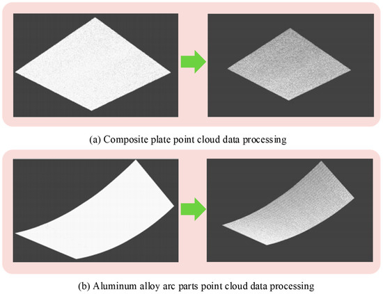 Composite flat plates and aluminum alloy arc parts are widely used in industrial manufacturing, which can validate their universality and applicability. The study aims to quickly obtain 3D information of the surfaces of composite flat plates and aluminum alloy circular arc parts through line laser scanning. To ensure the stability and accuracy of the scanning, the line scanning speed is set to 1 mm/s, and the scanning-collected point cloud data is preprocessed, as presented in Figure 8. The preprocessed point cloud data was more streamlined, with effective removal of noise and redundancy. At the same time, the accuracy and reliability of the data were greatly improved.