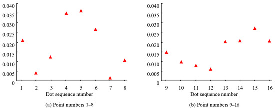 The study investigates the relationship between normal fitting error and curvature while maintaining a constant measurement angle and a fixed range of point cloud selection. Taking the point cloud range diameter of 30 mm as an example, the corresponding normal fitting error data is shown in Figure 11. From Figure 11, there was an inverse relationship between curvature and normal fitting error. This is because when the curvature is small, the area where the point cloud data is located is closer to the plane, which makes the process of fitting the normal direction simpler and more accurate.