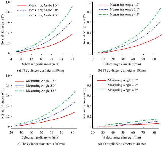 Changes in point cloud range, angle measurement methods, and fitting errors for cylinder diameters of (a) 50 mm (b) 100 mm (c) 200 mm and (d) 400 mm.