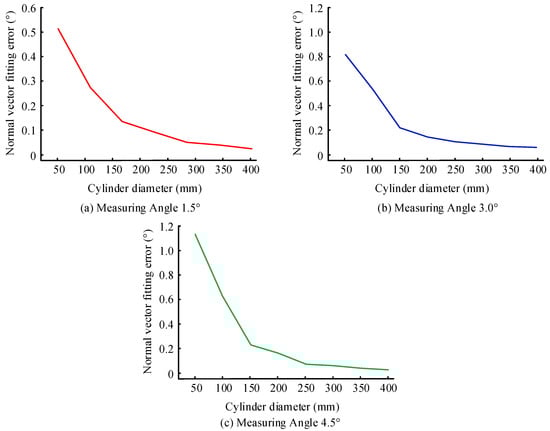In Figure 10b, when the diameter of the cylinder was 100 mm and the selection range of the point cloud was 20 mm, the measurement error of 4.5° was 0.019° larger than that of 1.5°. When the selection range of the point cloud was 40 mm, the measurement error of 4.5° was 0.127° larger than that of 2°. From Figure 10a,c,d, with fixed curvature and measurement angle, the larger the selection range of the point cloud, the greater the normal fitting error, and it shows a nonlinear growth trend. When the point cloud range is small, the curvature has a relatively small impact on the normal fitting error due to the relatively simple distribution of point cloud data. Once the selection range of point clouds increases to a certain extent, the influence of curvature becomes particularly significant, leading to a significant increase in the deviation between the fitted normal and the actual normal.