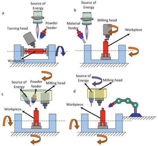 Hybrid DED by machining, (a) turning with PAAM, (b) multi-axis milling with PAAM, (c) integrated laser powder head DED with multi-axis milling, and (d) separate laser and powder head DED with multi-axis milling [108].
