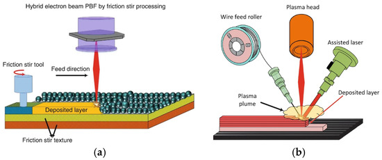 Hybrid AM by heating, (a) Hybrid Electron Beam Powder Bed fusion (EB-PBF) by friction stir processing, (b) Hybrid PAAM by assisted laser [108].