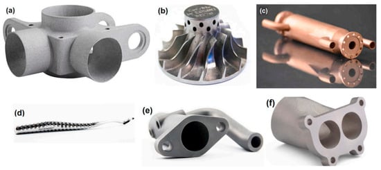 Sample of metallic materials printed using AM techniques (a) AlSi10Mg, (b) Cobalt Chrome CoCrMo, (c) Copper C18150, (d) Ni Alloy 718, (e) SS 316 L, and (f) Ti64 [141].
