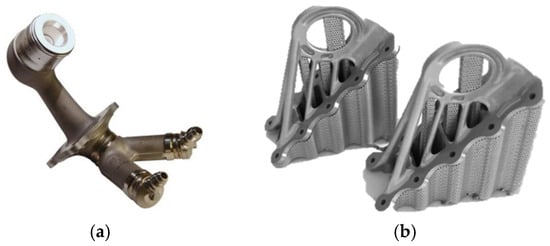 (a) GE’s fuel nozzle, which is additively manufactured for LEAP engines [171], (b) Airbus A350 XWB cabin bracket built by GE Additive’s LaserCUSING R SLM additive manufacturing process [172].