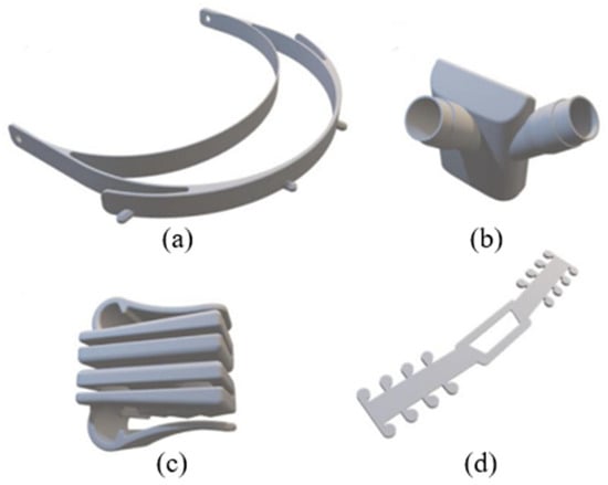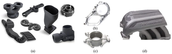 (a) 3D-printed car parts; (b) topology-optimized bracket [174]; (c) Steering knuckle [172]; (d) Ford’s 3D-printed intake manifold [175].