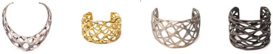 - Al-Nabi, S.M.A.; Ibrahim, W.O.; Saad, M.E.-R.M.M.A. Additive Manufacturing in Metal Jewelry Industry: Analytical Study. Int. Des. J. 2023, 13, 141–150. [Google Scholar] [CrossRef]