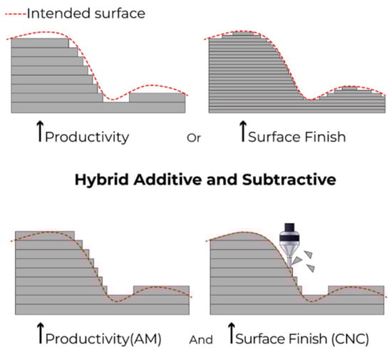The secondary process in hybrid AM is generally used to eliminate common defects encountered in conventional 3D printing such as keyholes, cracks, residual stresses, pores, etc. Each secondary process is tailored to a specific application, which must be selected based on these requirements. Secondary processes can be based on cold working, such as burnishing, rolling, shot penning, and machining. It can also use or generate heat, as in friction stir welding, laser-assisted hybrid AM, electron beam welding, and pulsed laser deposition [108]. Figure 10 and Figure 11 show the principle of some AM hybrid techniques with different secondary processes.